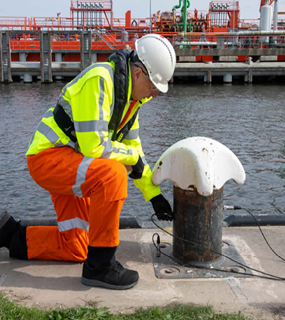 Smart, simple, safe! When scanning a bollard we place a number of sensors on the surface of the structure above the ground. A vibration is initiated by tapping on the bollard in various directions and with various forces. Experiments have proven that the bollard and around 1 m3 is covered by the vibration. The returned vibrations will be recorded and analysed by a sophisticated computer program. This will result in a number of graphs. The results of the test and the visual inspection form the basis for clear and concise reporting including a risk analysis.